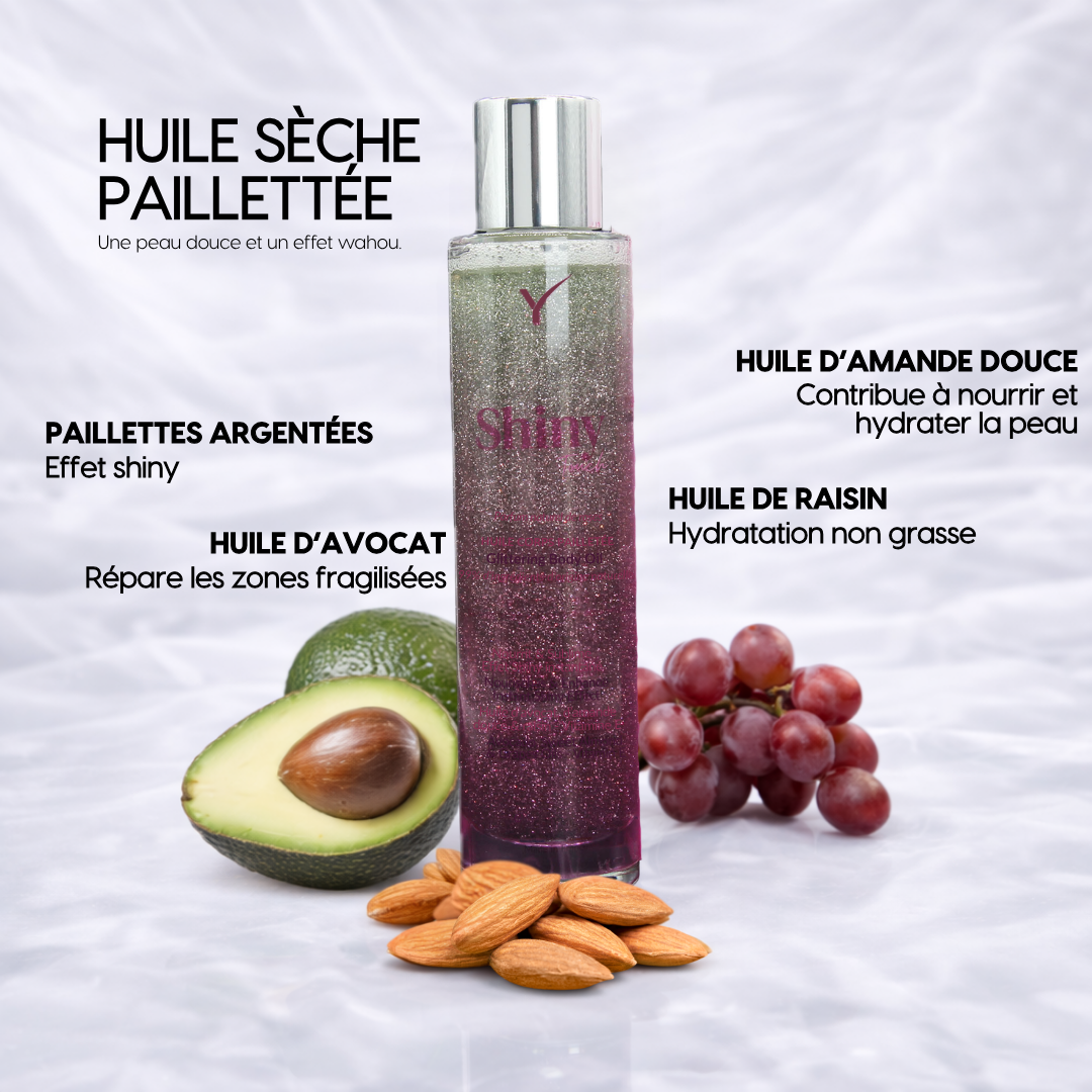 Its formula, with 98.51% ingredients of natural origin, combines precious plant oils (avocado, sweet almond, grape seed) with delicate silver shimmer particles for an instant glowing effect.