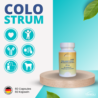 Cow Colostrum powder, contains 30 % immunoglobolin (IgG), hydroxy propyl methylcellulose (vegan capsule shell), anticaking agent (magnesium salts of fatty acids).